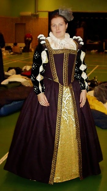 These photos were taken by my friend Sara in 2007 maybe? In this picture from 2001 I'm wearing a forepart of gold coloured rayon damask, although not as shiny in reality as on this picture. Must be due to the flash. Note the very spiffy gym hall background.